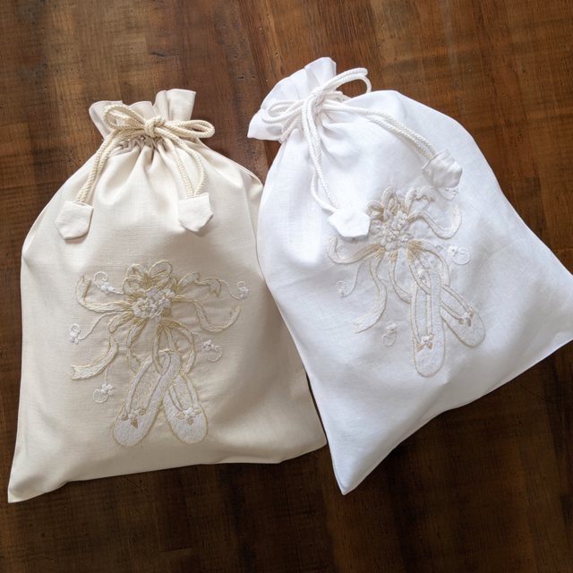可愛らしいトゥーシューズが刺繍された、リネンの巾着です。 品のある落ち着いた色合いで、とても綺麗に刺繍されています。 カラーバリエージョンは、ライトベージュとホワイトの2色ございます。 ご旅行や、習い事の時などにどうぞ。 *素材 :表地 麻 裏地 なし 刺繍糸 綿 *サイズ たて 約40cm × よこ 約30.5cm 以下、ご了承ください。 *ひとつひとつ手刺繍をしている為、写真と全く同じでない場合がございます。 *ひとつひとつ手作りの為、記載のサイズと多少ズレがある場合がございます。 *実物の色となるべく同じに近づけるよう心がけていますが、スクリーンの環境などによって、異なる場合がございます。 *ウイルスを完全に予防するものではございません。 配送方法 *送料無料(スマートレターでの配送 / 追跡なし/ ポストへ投函) *レターパックライト(追跡あり/ ポストへ投函) *レターパックプラス(追跡あり/ 直接お渡し)